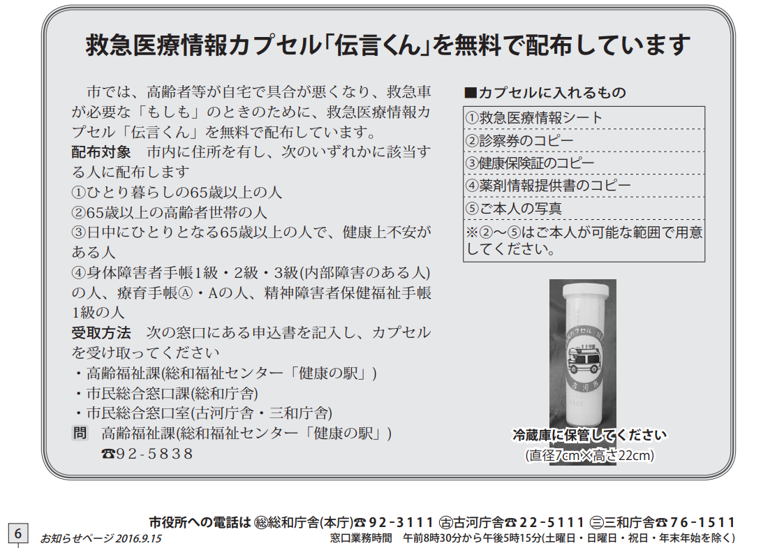 介護が必要な家族がいる家庭では、一番ケアを担う方が急変した際に当事者の情報がわかるリスト(古河市では救急医療情報カプセル「伝言くん」)を作成しておくとよいそうです。