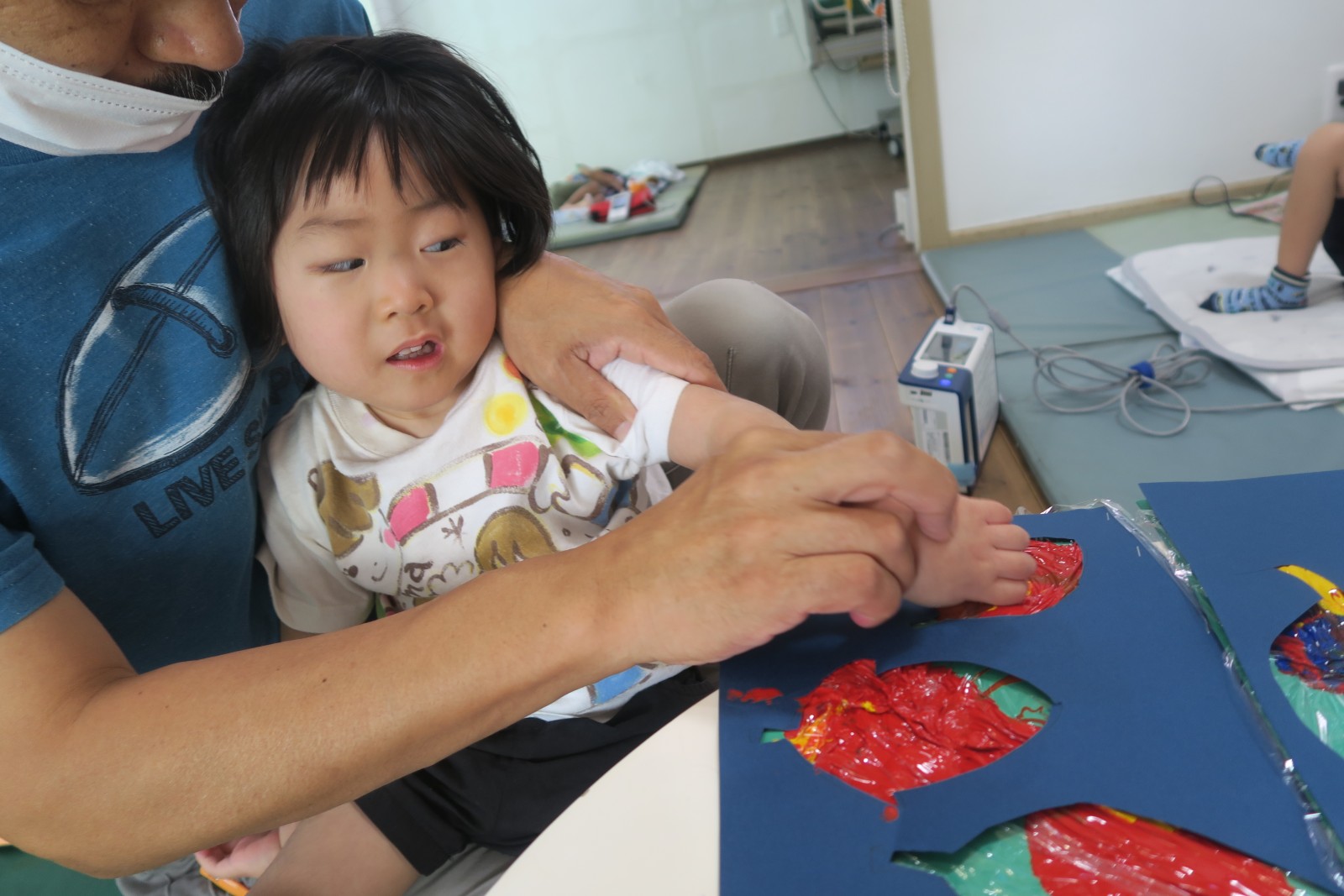 画用紙の上に好きな色の絵の具を3色選んで出しました。