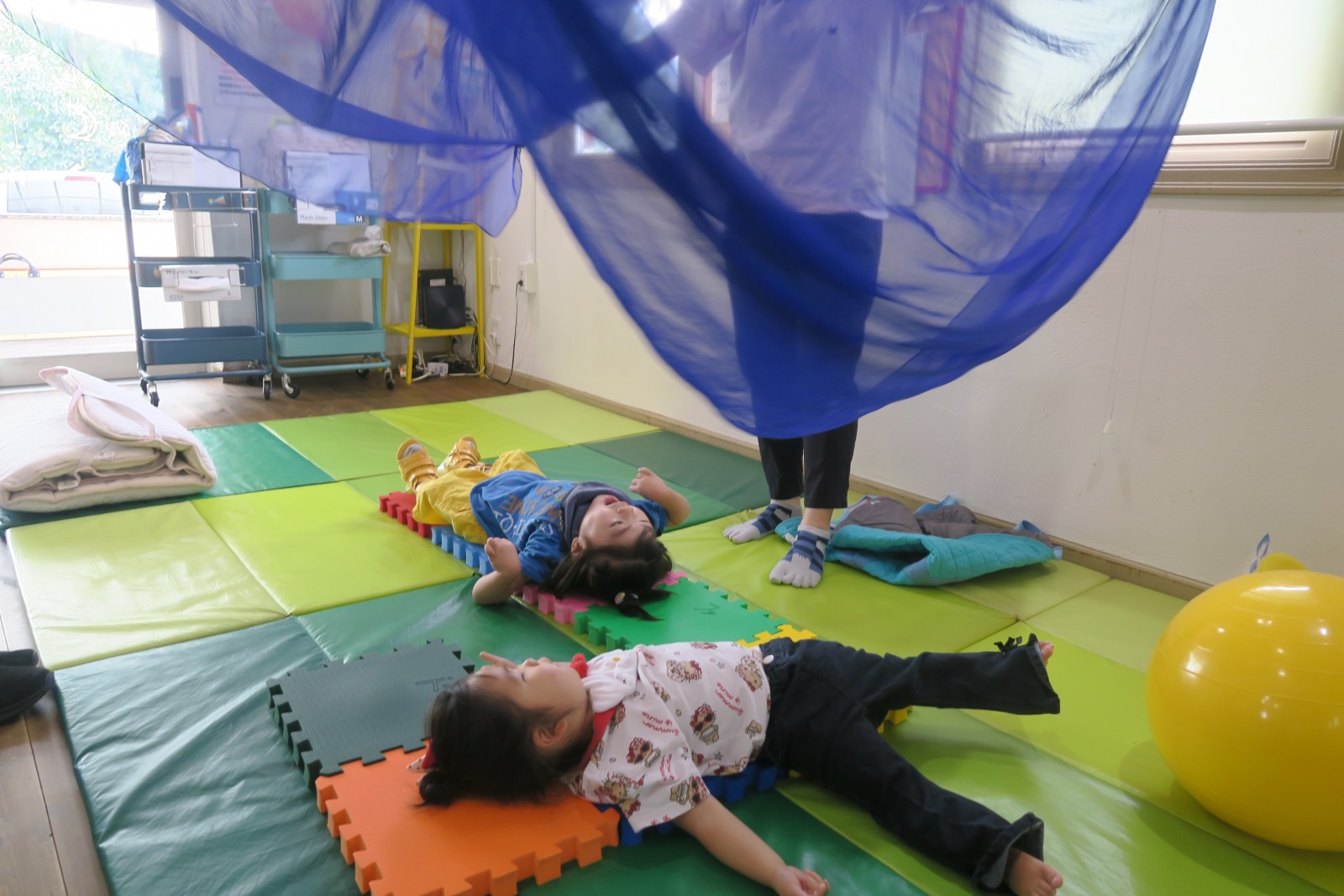ドレミマットの上にゴロンと寝転がって、その上にシフォン布をフワッとかけて遊びました。