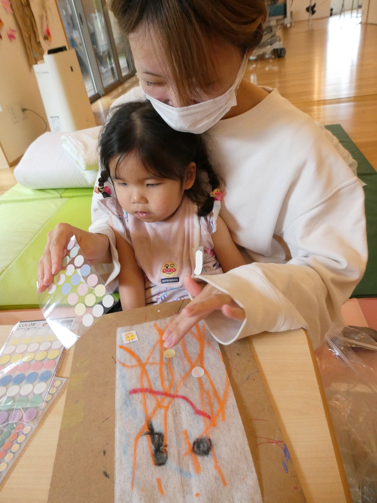 クレヨンでお顔を書いたりお花紙や折り紙を割いて貼り付けました。