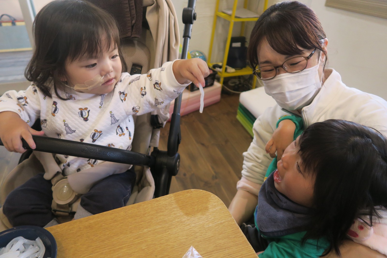 上手につかめたお友だちが、お隣のお友だちに「見てみて~👀」っと差し出してみると