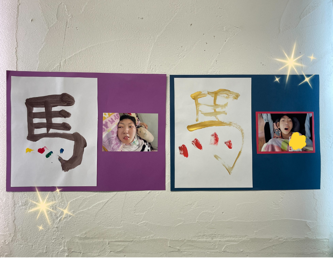 手に茶色い絵の具を塗ってペタッとはがきに押して、背景などを彩って出来上がり✨