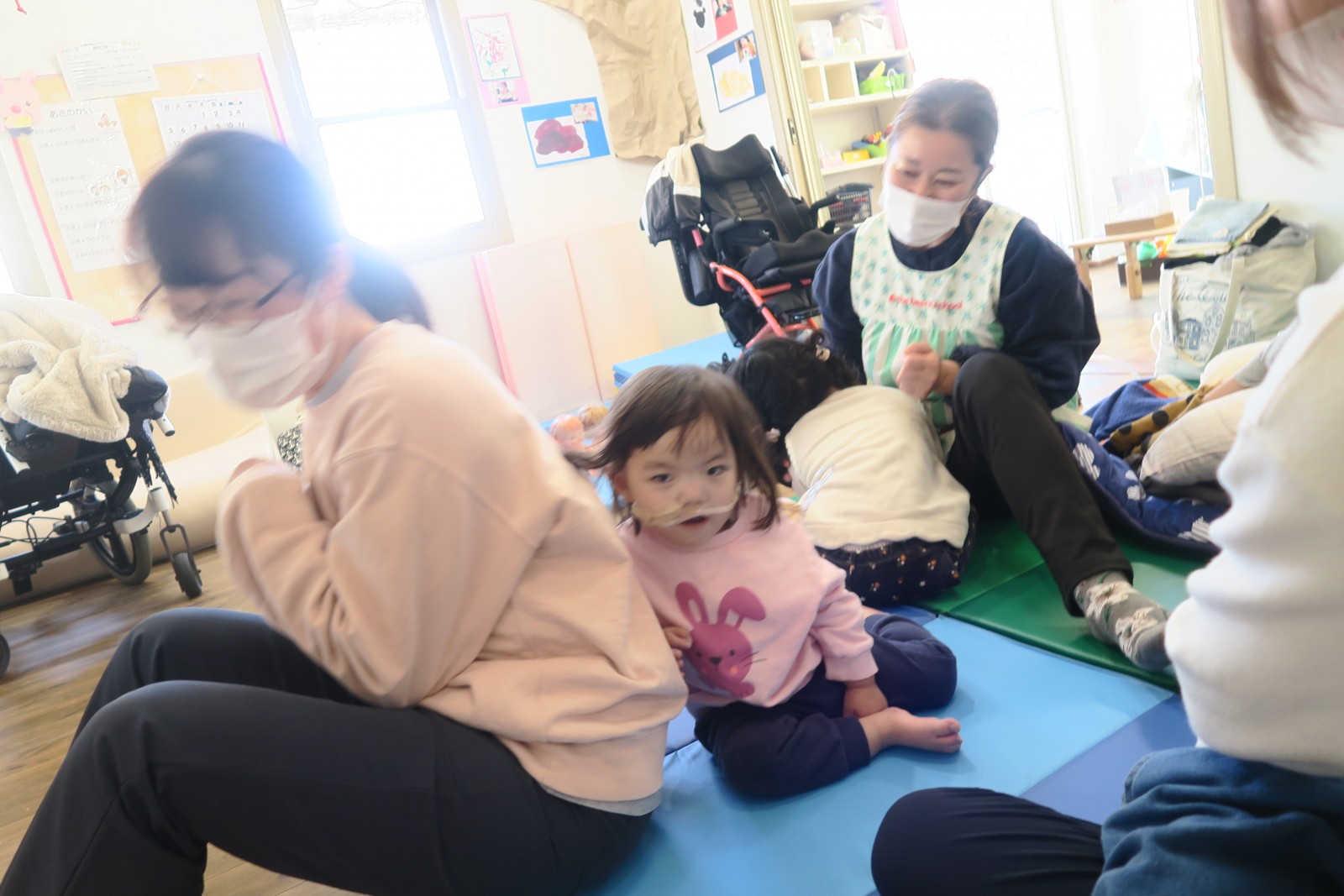 スタッフと背中を合わせたり、だっこしたり