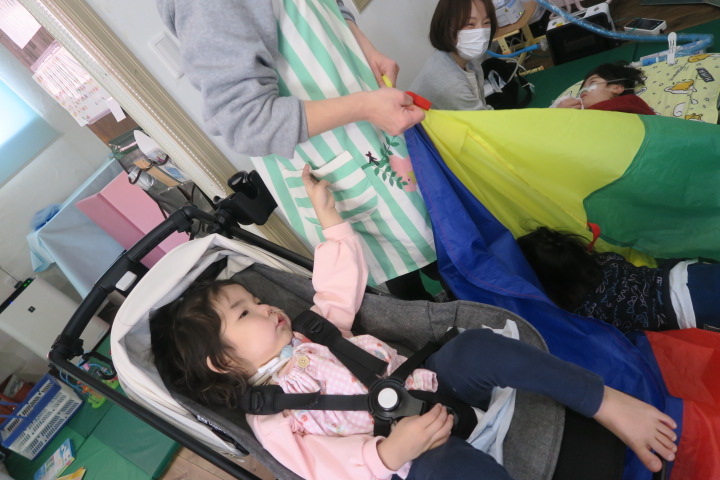 パラバルーンを広げて、スタッフの掛け声とともに開いたり、閉じたり🎶