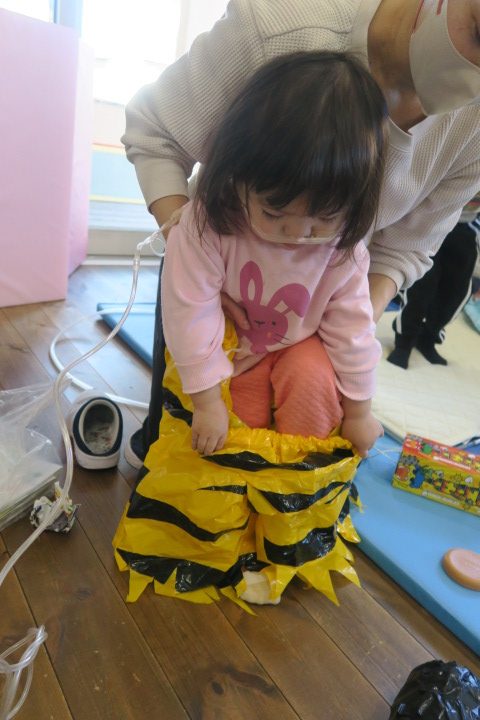 「鬼さんのパンツはいてみたい!」とご希望のお友だちは片足を入れて履いてみましたが、