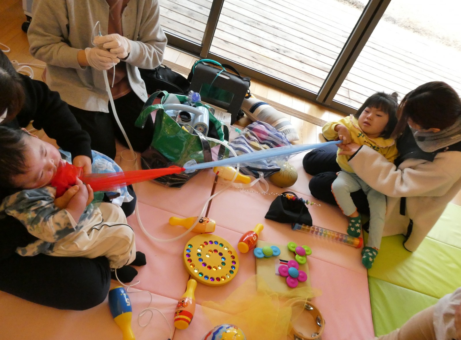 オーガンジーの優しい布を繋げて、わっせわっせと引き合う綱引き!