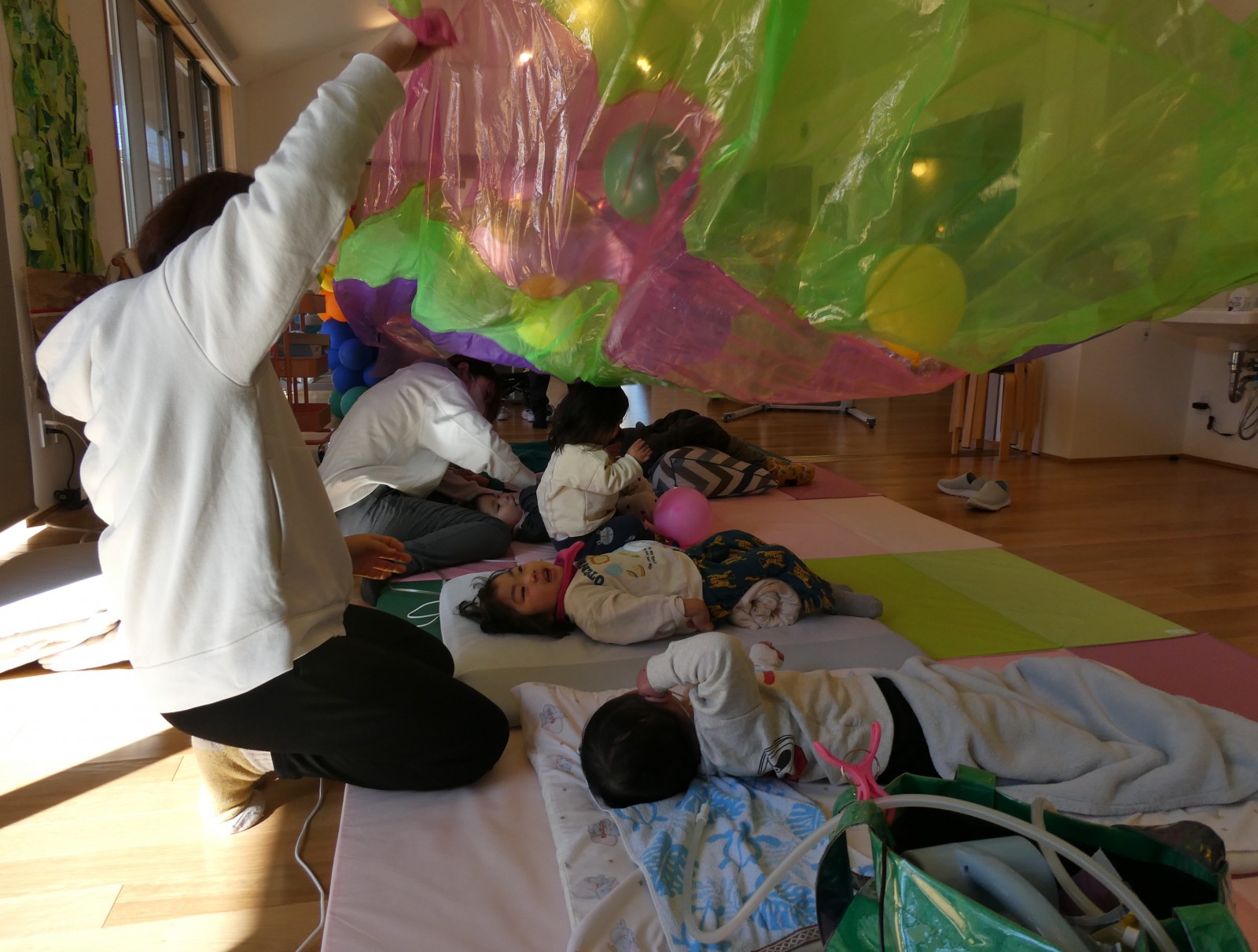 その上にカラフルな風船を飛ばして、ビニールを上下に揺らしました