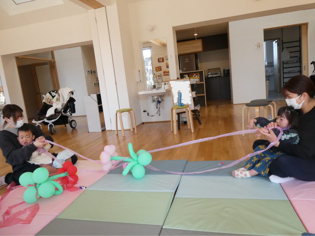 お友だちとふたりで向かい合い、テープの両端を持って優しく引き合います